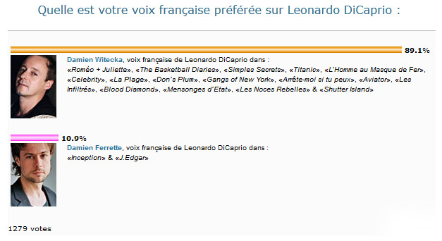 Le 02 Juillet dernier nous vous avons demandé : « Quel est votre voix française préférée sur Leonardo DiCarpio : Damien Witecka ou Damien Ferrette ? ». Vous avez voté pendant 2 mois, et le sondage a pris fin cette nuit à minuit.